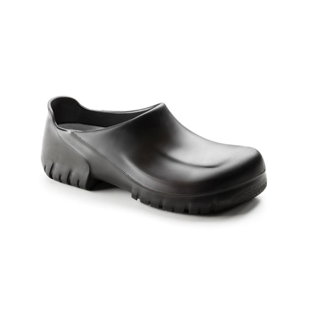 Birkenstock A640 fekete klumpa. Acél orrmerevítővel ellátott, pofessional poliuretán klumpa. Teljesen zárt dizájn, bőrbarát PU, megemelt sarokrész biztosítja a láb megfelelő biztonságát. Anatonómiailag kialakított, BIRKENSTOCK parafa-latex talpbetét. Ez a kivehető talpbetét 30°C-ig mosható, illetve maga a klumpa 80°C-ig mosható, ami kiemelkedő higiéniát biztosít. PU, csúszásmentes (SRC), olaj-és zsírálló talp.