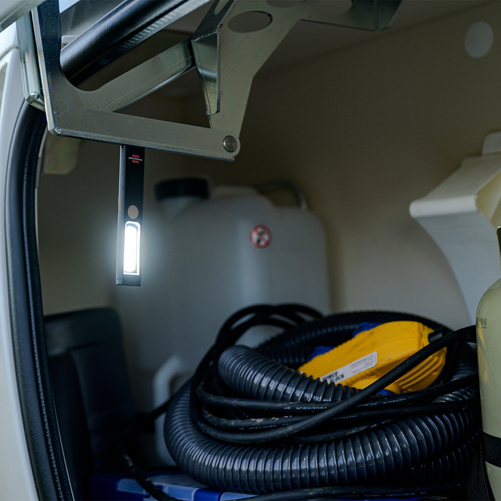 A beépített akkumulátorral (Li-Pol akkumulátor 3,7 V / 450 mAh) ellátott újratölthető műhelylámpa ideális a legszűkebb helyiségek megvilágítására, vékony és praktikus kialakításának köszönhetően