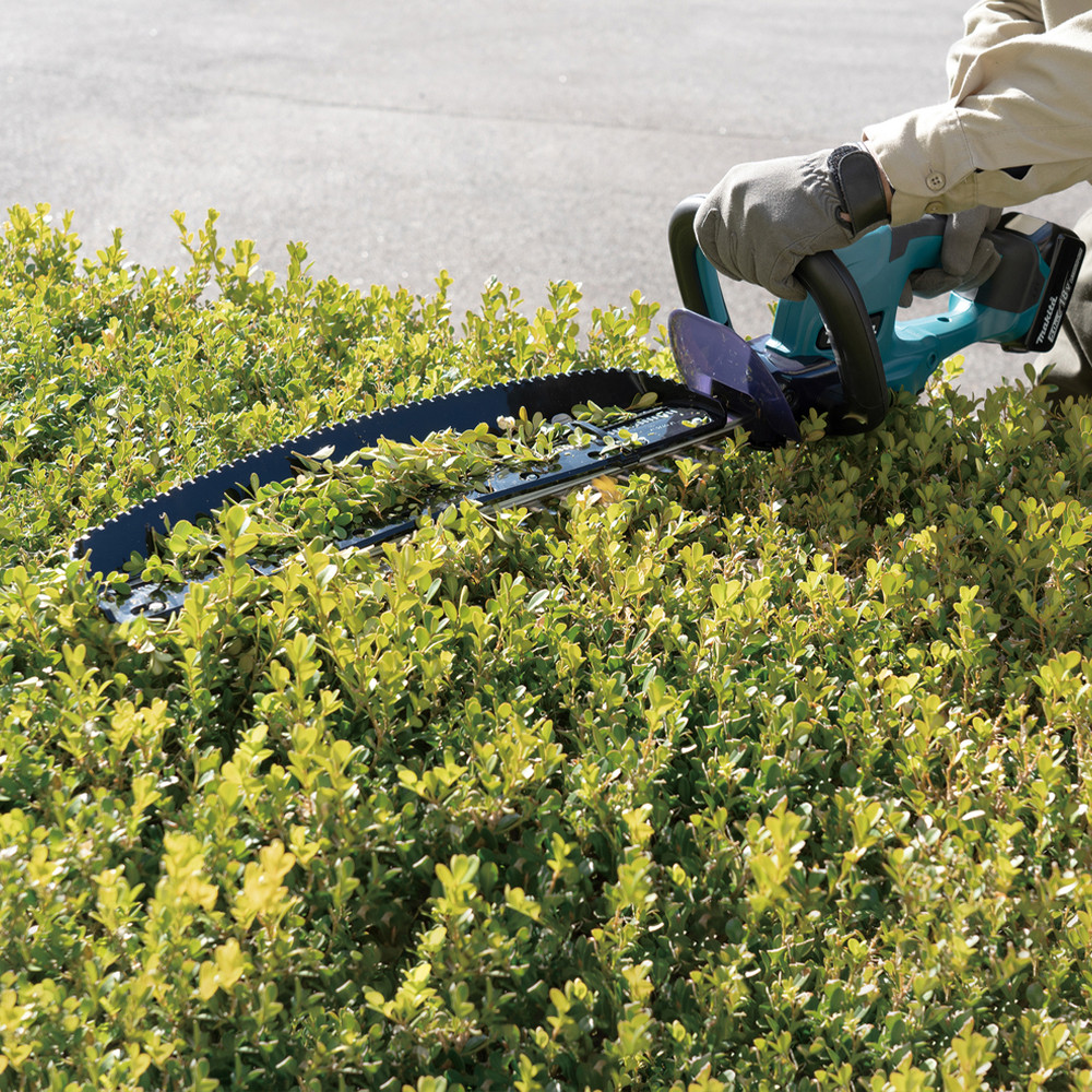A Makita DUH507 akkumulátoros sövényvágó alacsony vibrációval, alacsonyabb zajkibocsátással, kis tömeggel és közvetlen károsanyag-kibocsátás nélkül végzi feladatát