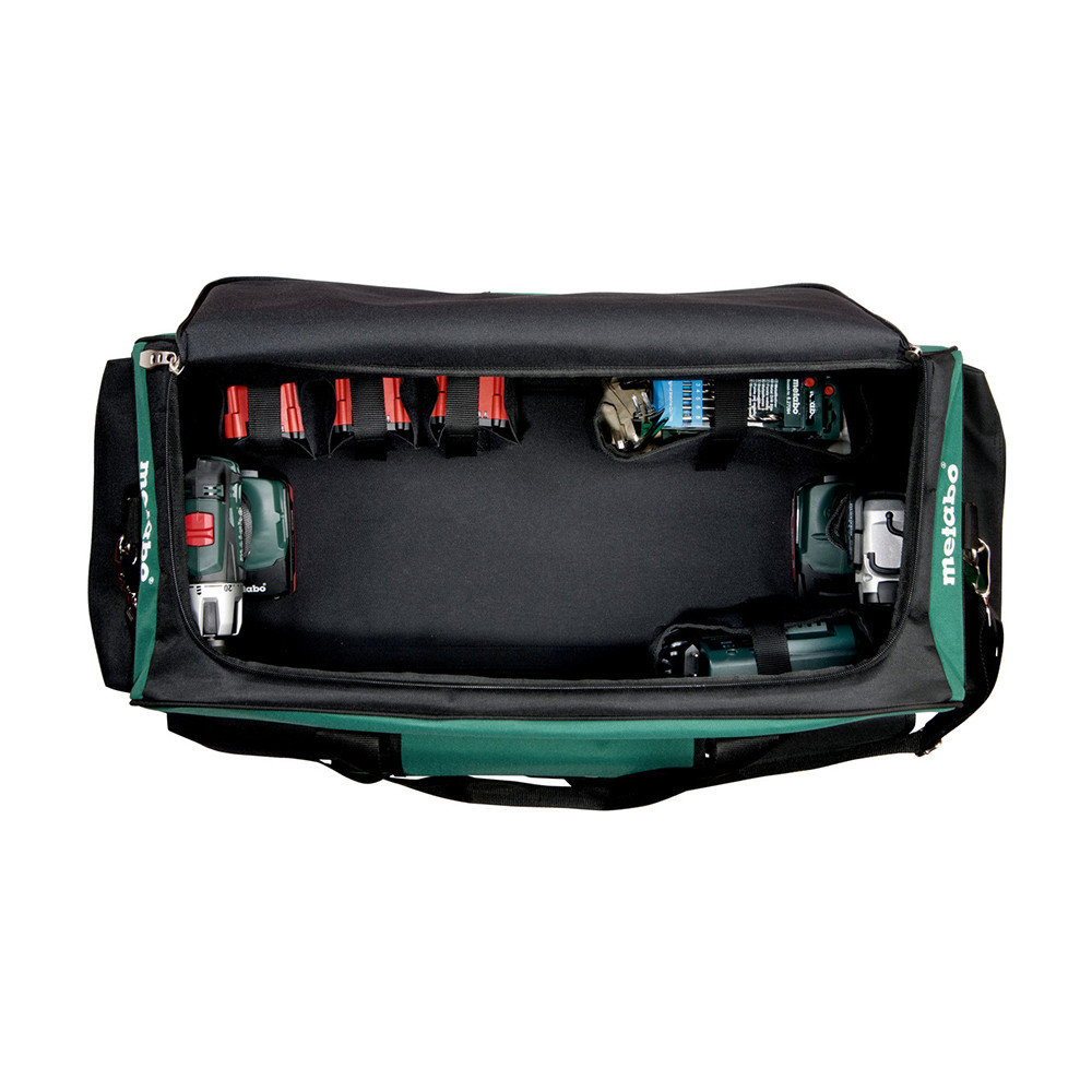 A táska belső részén öt táskabeosztás található tépőzárral három akkuegységhez, egy töltőhöz és tartozékokhoz