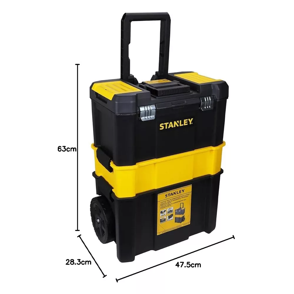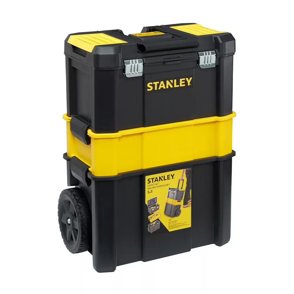 • A STANLEY® Essential™ gurulós műhely fémzárakkal egy hordozható műhelymegoldás, amely egy extra nagy tárolórekeszt, egy közepes méretű hordozható tálcát és egy közepes méretű szerszámosládát tartalmaz – így ideális elektromos szerszámok, kéziszerszámok, rögzítőelemek és tartozékok tárolására