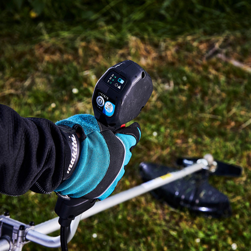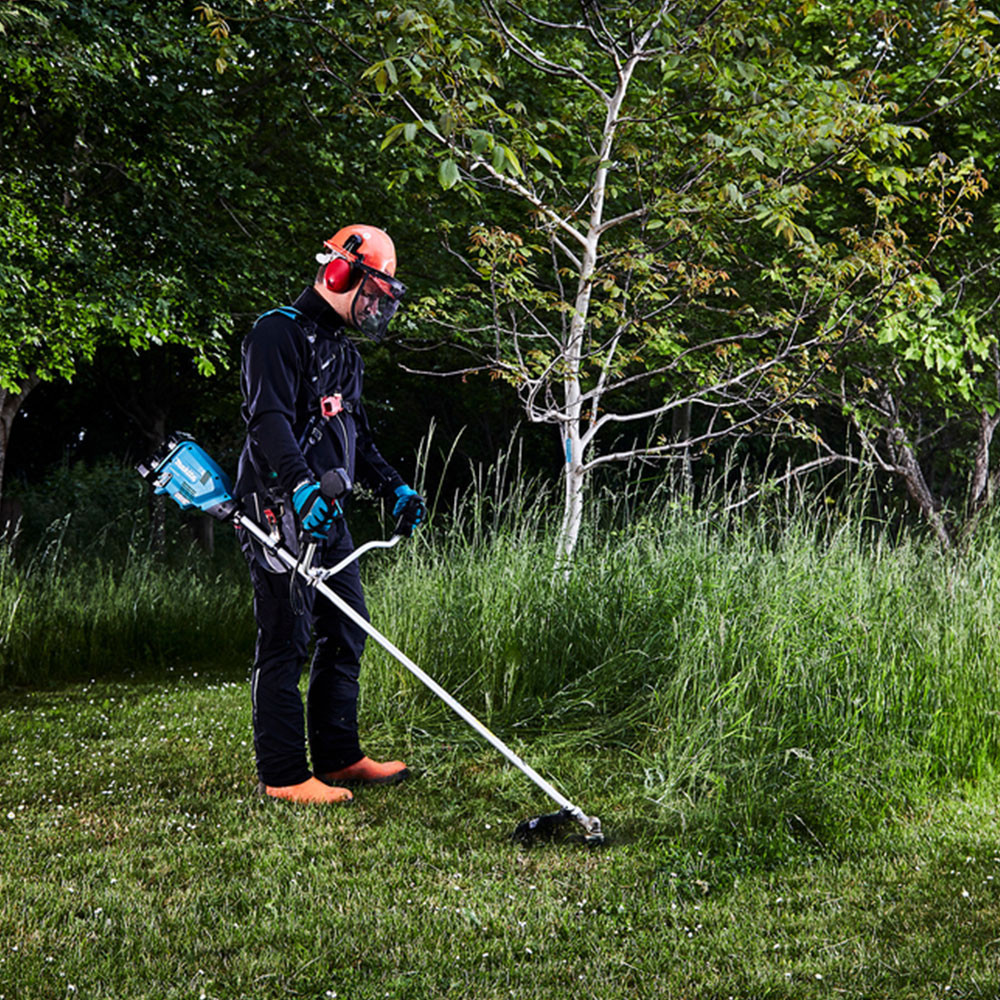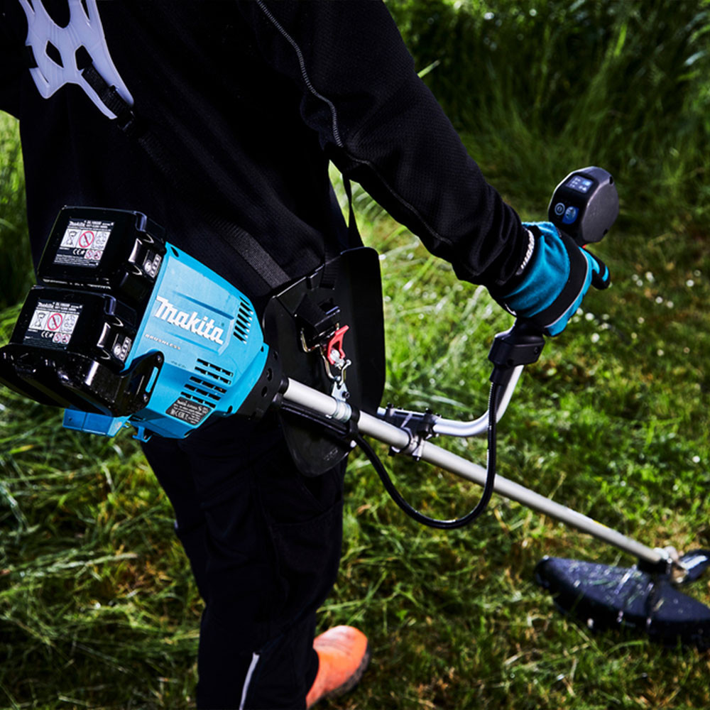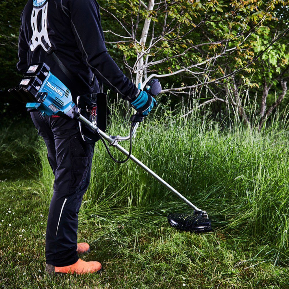 Makita akkus fűkasza alapgép Akkumulátor és töltő nélkül Damilfej3 ágú késfej Bozótvágó kés 255 mm Védőburkolat Kettős vállheveder Szerelőkulcsok Tartozék tok Kartondoboz