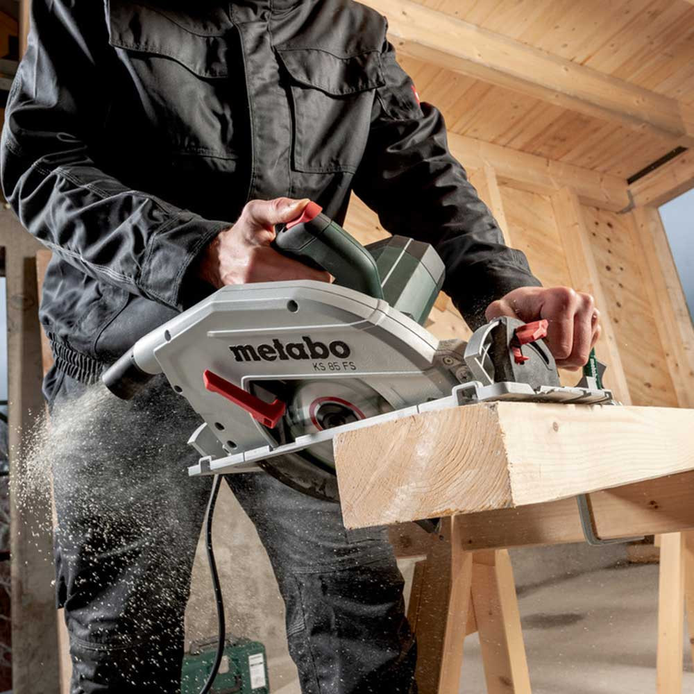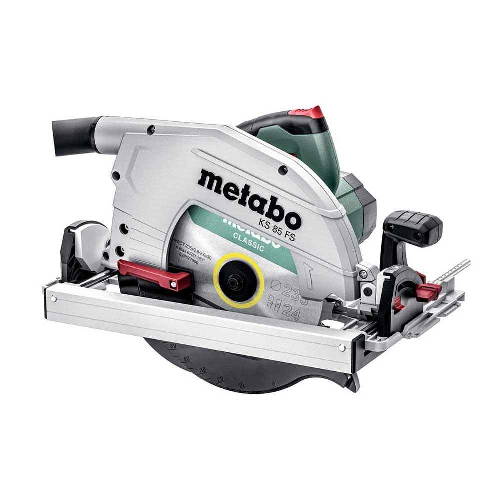 Metabo KS 85 FS kézi körfűrész Keményfém körfűrészlap (24 fog) Alumínium párhuzamvezető Imbuszkulcs Kartondoboz