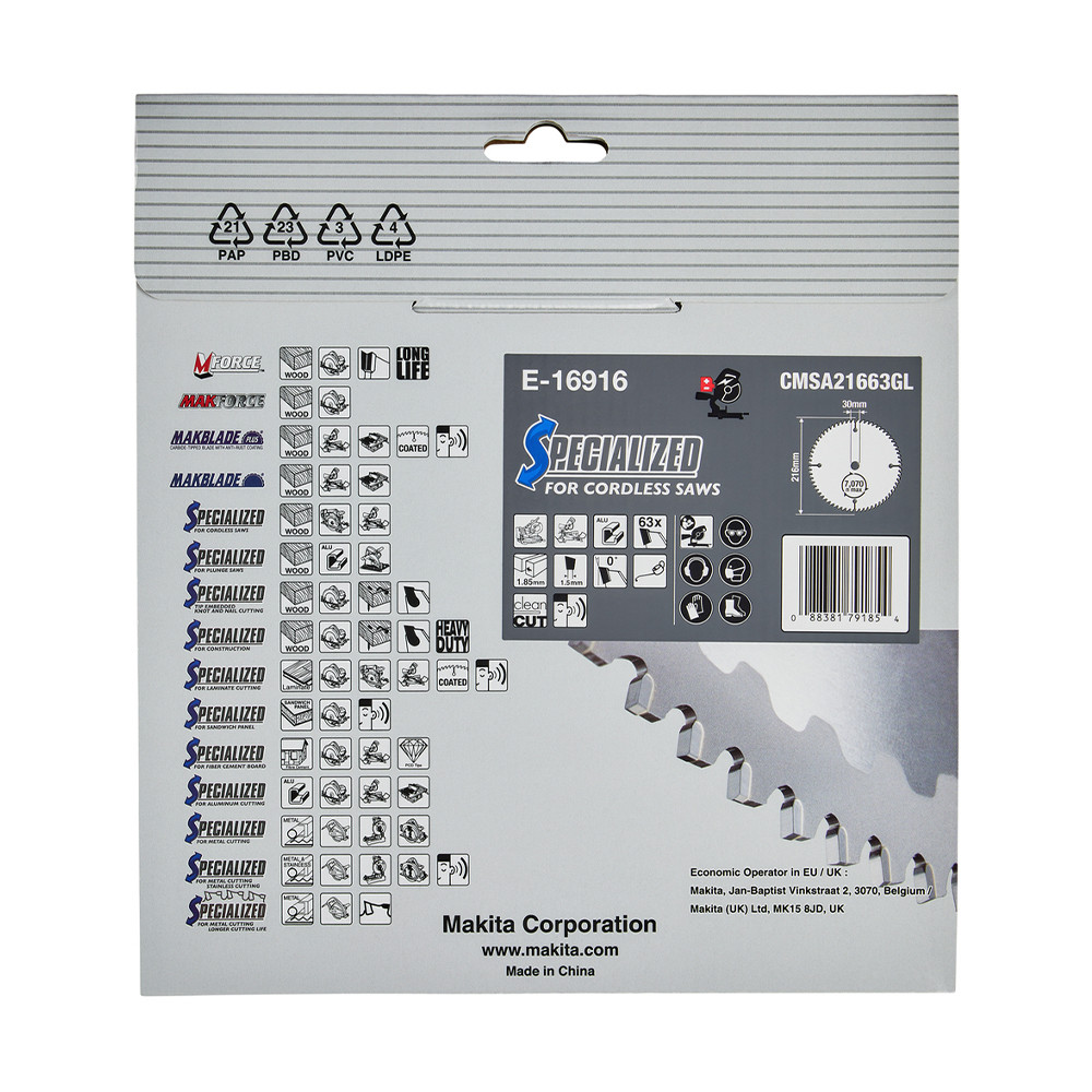 Makita EFFICUT körfűrészlap akkus géppel, alumíniumhoz 216x30x1,85mm 63 fog