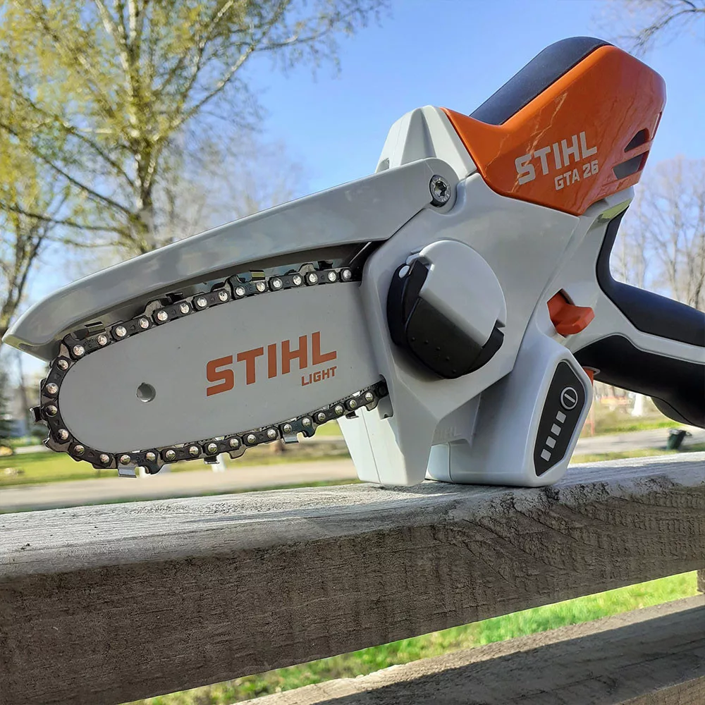 - Ergonomikus, csúszásmentes markolat, szerszám nélküli lánccsere, rugalmas védőburkolat a biztonságos munkavégzés érdekében, akkumulátor töltöttségi jelző.(Megjegyzés: A GTA 26 modell AS 2 típusú akkumulátora a STIHL HSA 26 akkumulátoros sövénynyíróval is kompatibilis, azonban a korábbi modellekhez, mint pl. a HSA 25 sövénynyíróhoz nem alkalmas.)